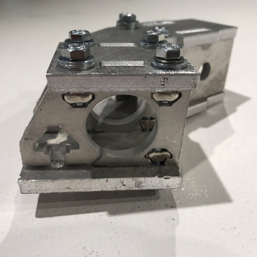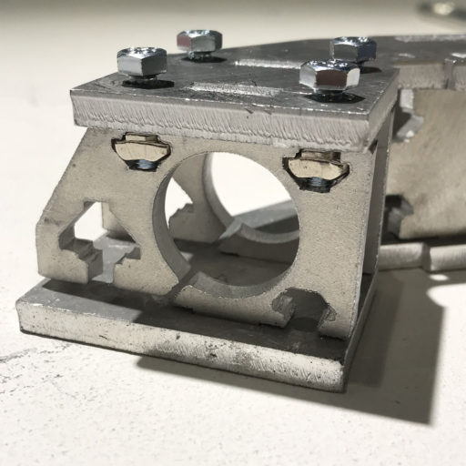 そこで、筆者は一つずつ資料をみながらパーツを組み立てて行った。形状を成す部品は主に5mm相当のアルミの板材である。それが筒状になるように組み合わさって、フレームの機能を持つのである。結合は、ハンマーナットをアルミ板に作られている溝に入れて、ボルトで締め付けるだけだ。しかも、いくら5mmの厚さとはいえ、アルミの板にハンマーナットのために複雑な溝を作っているので、どうも強度面で不安に見える。
