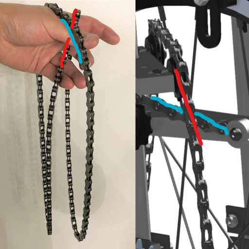 そういう状況は、制作が大部分終わった時、チェーンをかけようとした時も起こった。不思議なことに、Bellcycleではチェーンを長くして一回ループさせている。つまり、一か所がねじれていてメビウスの輪のようになっているのだ。そしてこれをいくつかのプーリーにかけて、メインのクランクに繋がっている。そうすることで、ギア比率を大きくし、走行性を上げているのである。