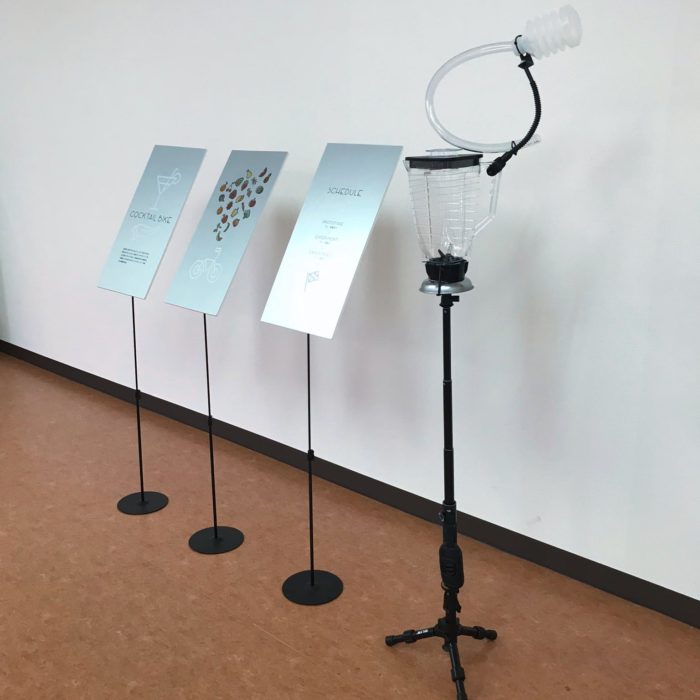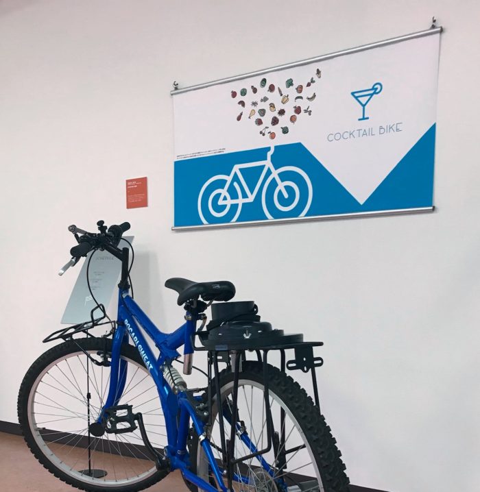 ちなみに、カクテル自転車は、ボリス・ヴィアンの小説「うたかたの日々」に登場するカクテル・ピアノに由来している。その仕組は定かでないが、後の映画では機械仕掛けの奇妙な装置として描かれる。一方、カクテル自転車は自転車の傾きによって食材が落下し、前輪によってブレンダーが回転する。プリミティブな仕掛けによって、味わい深いカクテルが出来上がることを期待したい。