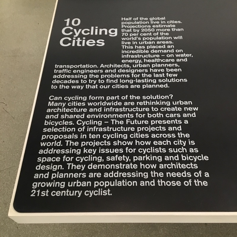 実は、10 Cycling Citiesは必ずしも自転車に適した都市ではない。その説明パネルによれば、今後ますます都市への人口集中が進み、インフラへの要望が飛躍的に高まる。その時にサイクリングが何らかの解決策になるだろうか?そのような観点で示唆を与える都市を取り上げる、といった趣旨らしい。それでは、世界的に見て東京がどのような示唆を与えるだろうか?それが次なる問いだ。考えてみて欲しい。