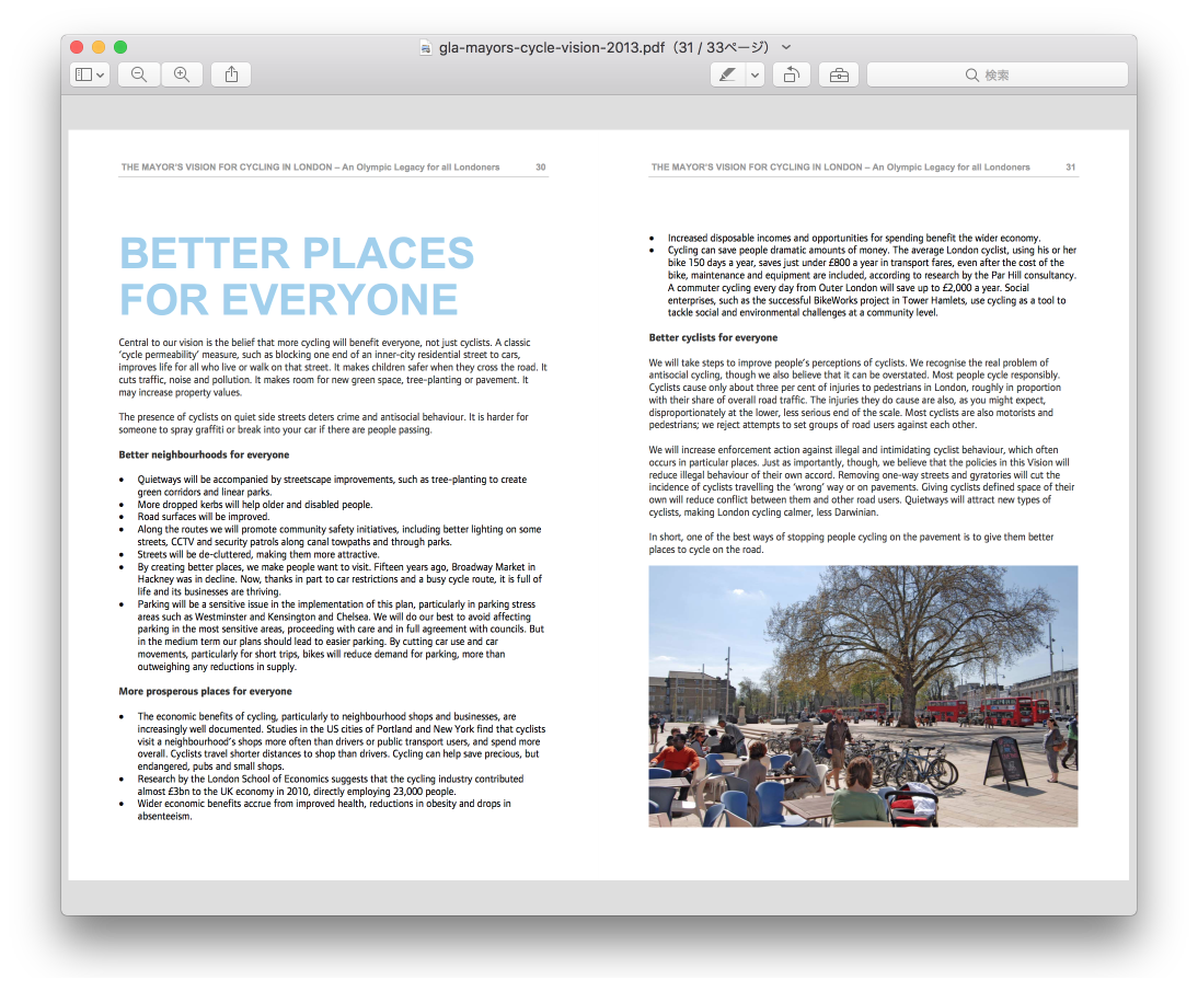 これは「ロンドンでのサイクリングに関する市長構想」であり、サブタイトルは”An Olympic Legacy for all Londoners”、つまり「オリンピックの遺産をすべてのロンドン市民に」となっている。2012年に開催されたロンドン・オリンピックの関連施設や都市インフラを活用すべく、2013年6月に提言されている。冒頭には当時の市長であったボリス・ジョンソンの序言があり、こんな文で始まる。
