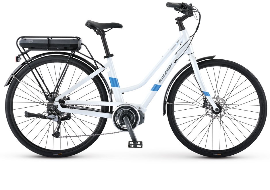 同じRaleighのDetour IE Step-Throughは、いわゆるママチャリ・タイプ。こちらも白地に水色のラインが入って爽やかだが、後部荷台の大きなバッテリーが愚鈍な印象を与える。実際には先のRoute IEとバッテリー・サイズの違いがないので、デザインと記憶がなせる技だろう。同じく重量も大差なく23kgほど。一方、モーターの出力は抑えられており、そのおかげで航続距離が長くなっている。