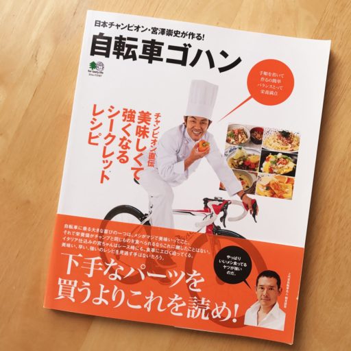 「Velochef」や「Feed Zone Portables」など欧米のサイクリスト向け料理本は、材料が入手しにくかったり、用語が分かりにくかったりして、必ずしも日本人向けではないようだ。そこで日本の自転車料理本を探してみたところ、唯一見つかったのが「日本チャンピオン・宮澤崇史が作る!自転車ゴハン」。ソツのない表紙に悪い予感をいだきながら取り寄せてみたところ、見事に想像した通りの内容だった。