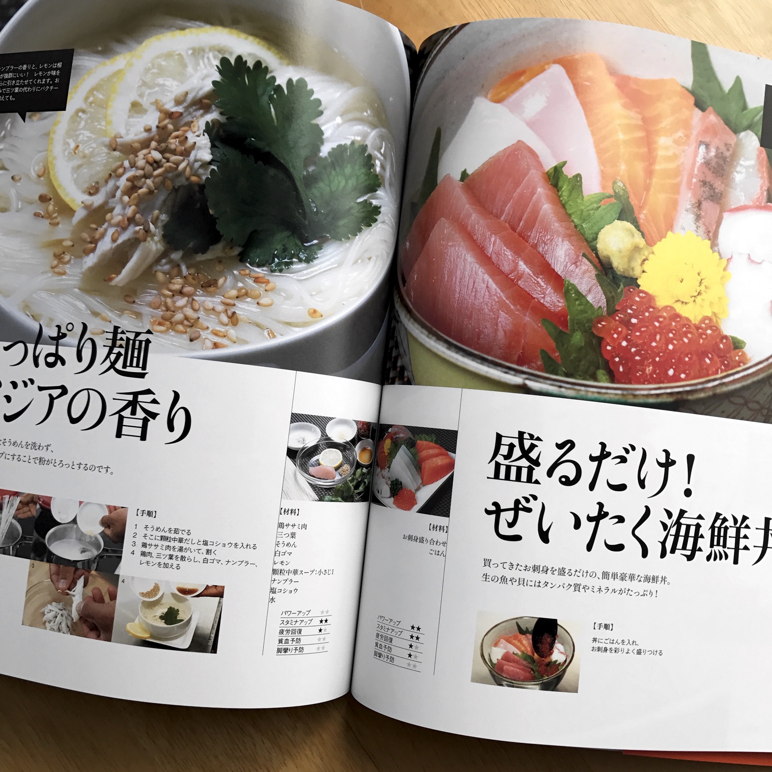 ランダムにこの本の料理を拾ってみると「男の豚キムチ」「彩り温野菜」「かぼちゃのポタージュ」「トマトのスパゲッティ」など。これらがPart.1の「普段のレシピ」、確かに。Part.2はデザートでティラミスやプリン、ぜんざいなどが並ぶ。工夫すればカロリー制限できるらしい。そして最後のPart.3は目的別レシピで、パワーアップや疲労回復などに応じた料理。足つり予防には海鮮ヤキソバだとか。