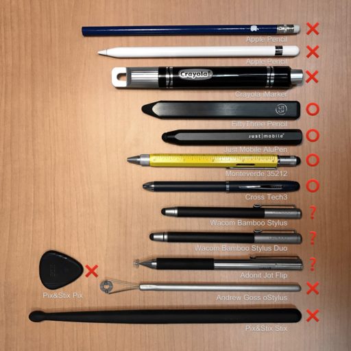 専用スタイラスではFiftyThree PencilとJust Mobile AluPenが申し分なく使えた。Cross Tech3やMonteverde 35212は多目的ペンのオマケと思いきや、意外にも操作性は良好。このうちFiftyThree Pencilは内蔵バッテリーで静電気を発生させるタイプ。このような自己静電発生型は使える可能性が高いが、Apple PencilやCrayolaはiPhoneでは使えなかった。筆圧感知など特殊な機能がないほうが良さそうだ。
