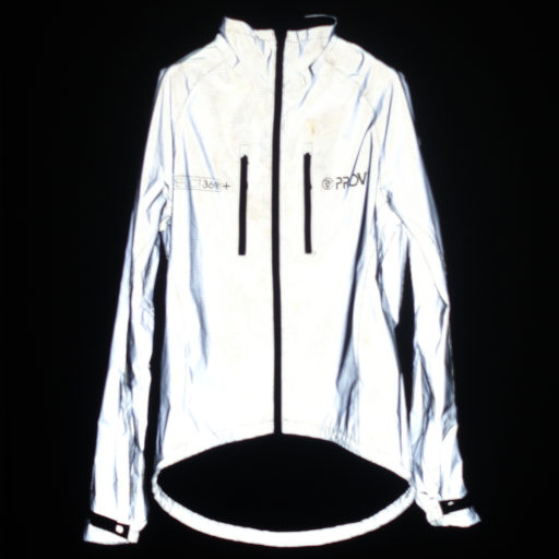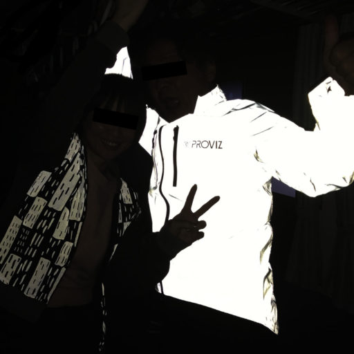 Provizは反射性の高いスポーツウェアの専業メーカーだ。サイクリング・ジャケットだけでも数種類あって、どれを選ぶべきか見当がつかない。そこでメールで問い合わせて、最も反射性能が高いと言うReflect360+を購入してみた。これは確かに反射性が高く、iPhoneでフラッシュ撮影をすると、以下の写真のように周囲が黒く写るほど。横の人も反射性ジャケットを着ているのだが、まるでレベルが違う。