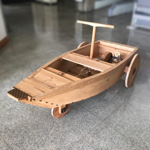まず、近くの市民会館に保管されている江戸時代の自転車、新製陸舟奔車(しんせいりくしゅうほんしゃ)の復元車を見学。その名にあるように小さな舟に他ならないが、その姿に衝撃を受ける。木製の車輪が3つ付き、T字型の取っ手もある。覗き込めば下駄やロープがしつらえてある。いずれも馴染みのあるものばかりだが、それらが有り得ない結合をする。作者は江戸時代のロートレアモンに違いない。