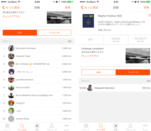 一方、Stravaでは2日目にして500kmを達成する人が次々と現れた。最終的なトップは日本人男性で3,000km近く走っている。1日平均370km、わずかな仮眠だけで走り続けたのだろうか。次点はアメリカ人女性。筆者は15,005位だが、500kmを超えたあたりはダンゴ状態なので、順位は意味がない。ただ、全参加者82,405人に驚かされる。正しくソーシャル・ネットワークが可能にするテクノロジーの祭典だ。