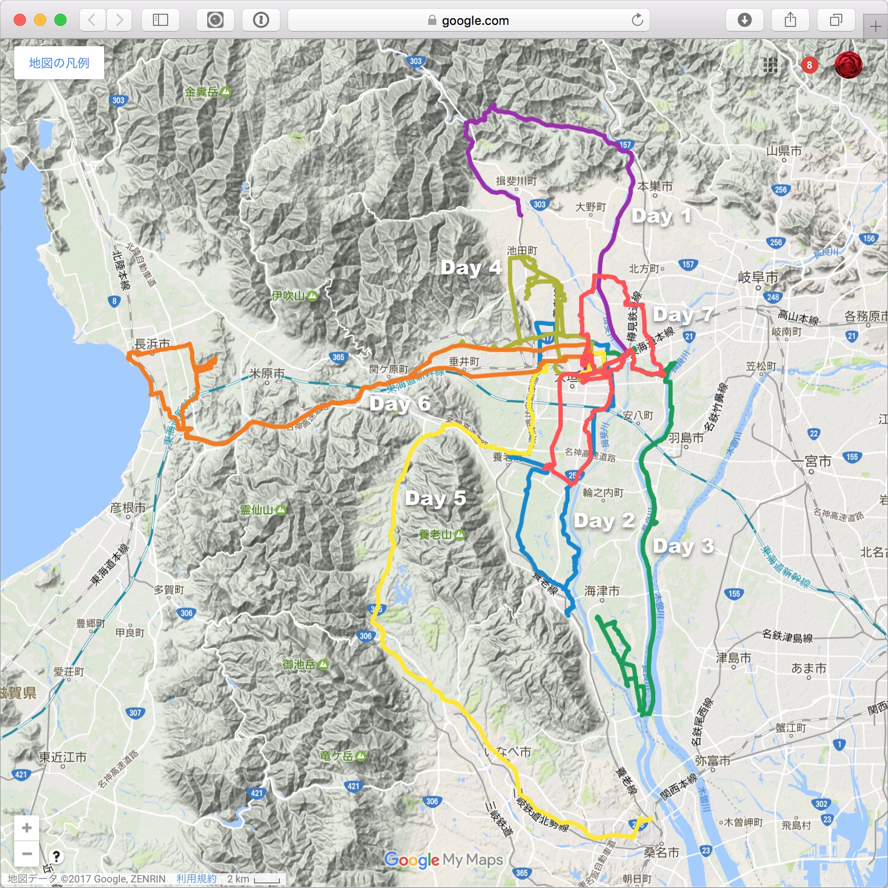 このような戦略を立てて、居住地の岐阜県大垣市を中心に周辺各地へ出かけた。平野部なので平地は多く、川沿いの道は走りやすい。寒いのは嫌なので、出発は朝9時以降。日没の夕方5時までのライド時間は長くても8時間。ただ、途中で休憩や食事をしたり、写真を撮ったり、メールやツイートをしたりで実走時間は半分もない。このようにして単独でFESTIVE500に挑戦した8日間を順に振り返ってみる。