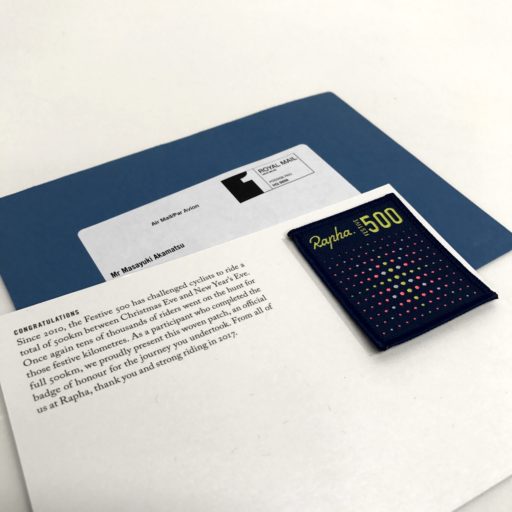 【追記】1ヵ月半ほど経った2月14日にFESTIVE500の完走証であるワッペンが郵送されてきた。厚手のフェルト地に精緻な刺繍が施されたワッペンは、年の瀬のライドのご褒美として相応しい。当時は寒さに震えながら出発したが、それでもまだ暖かったのだと思う、2月半ばの今日この頃だ。(2017.02.15)