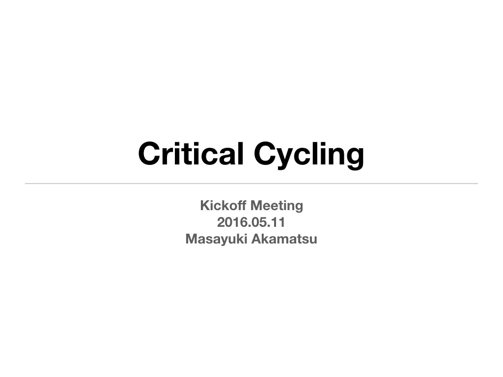 ちなみに、クリティカル・サイクリングという言葉の初出は、2015年12月11日のツイート。当初はクリティカル・デザインのパロディだったが、この言葉から触発されることが数多くあり、2016年4月9日の教員会議で今後の研究対象として発表。これが好評であったこともあって、学内外の関係者に呼びかけてミーティングを開催。このキックオフ・ミーティングで使用した説明資料を以下に掲載する。