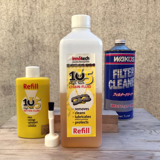 ただ、チェーンの清掃と注油は手間がかかり、頻繁に行なうのは面倒だ。しかし、驚くほど汚れを寄せ付けないチェーン・オイルがある。それがドイツ生まれのイノテック105。清掃は不要で、何ヵ月かおきに軽く注油するだけ。しかも、潤滑性が高いので、ペダルの回転が軽くなる。それほど素晴らしいオイルなら誰もが使いそうだが、実際には普及していない。なぜなら、最初の施工が恐ろしく大変だからだ。