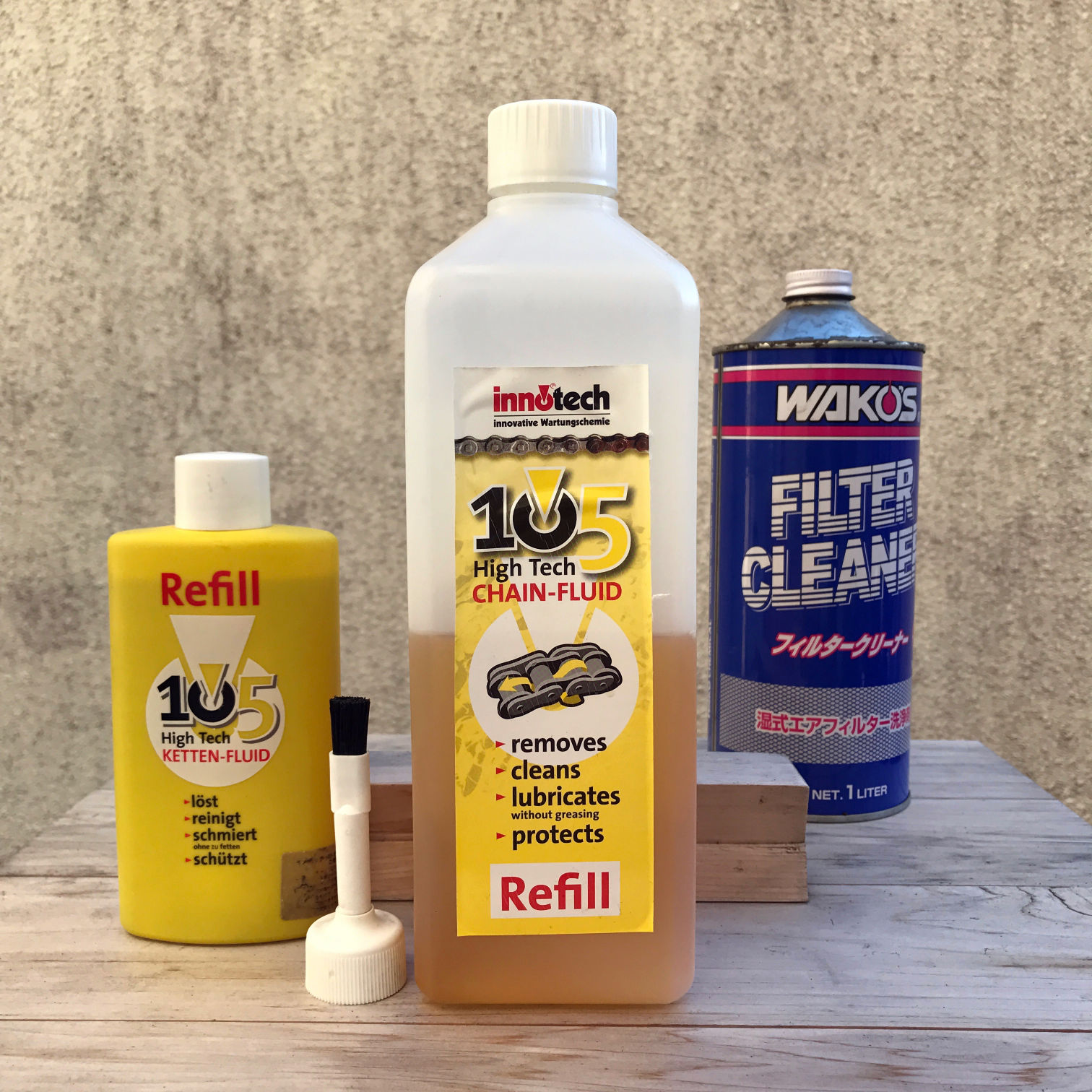なお、イノテック105を塗布しても、まったく汚れないわけではない。そこで、2〜3ヵ月に一度は再塗布をする。これは付属の刷毛でイノテック105をチェーンに塗るだけ。洗浄効果もあるので、多めに塗布すれば汚れが滴り落ちる。しばらく待って、ウェス(ボロ布)で余分を拭き取れば完了。1日くらいは放置して乾燥させるのが良いだろう。このように2回目以降のチェーン清掃は簡単に済む。