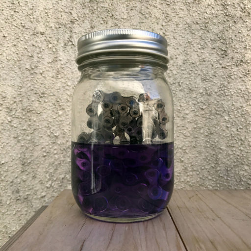 次に、チェーンを完全脱脂して、イノテック105を金属に直接塗布できるようにする。イノテック105は他のオイルと混じらないので、既に塗布されているオイルを除去するわけだ。このために、広口の瓶にチェーンと洗浄剤を入れてシェイク。濁りがなくなるまで、洗浄剤を入れ替えてシェイクを繰り返す。綺麗な状態になれば、チェーンに水をかけて洗浄剤を洗い流す。洗浄剤は灯油でも良い。
