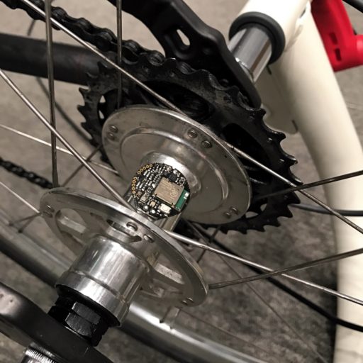 仮想ライド作品「The Ridable City」では、自転車の走行状態を的確に取得するために、Mbient社のMetaWear CPROを使用した。これはコイン・サイズのモジュールで、数種類のセンサ類とBluetooth LEのワイヤレス通信機能を持つ。これを自転車のハブに両面テープで貼り付ければ、高性能な走行センシングができる。SDK(ソフトウェア開発キット)も提供されていて、扱い方も簡単だった。