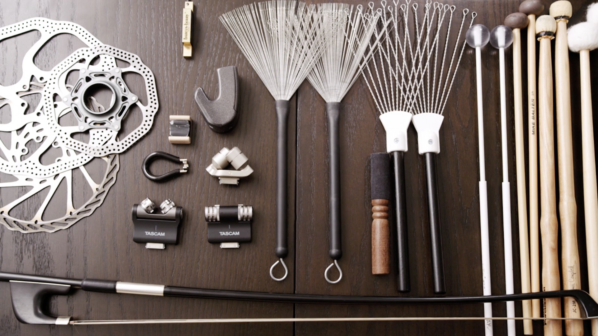 また、バイオリンの弓やマリンバのマレット、ドラムのワイヤー・ブラシ、木魚の撞木、ギターのピックなども使用されている。これらを使ってタイヤやスポークを叩いたり、擦ったりして音を発するわけだ。一般的な伝統楽器は一切使っていないそうだが、弓やマレットによる奏法は伝統的と言える。ピッチを整えるのにも役立ちそうだ。やや特殊な奏法だが、ゴム・ボールやE-Bowにニヤリとする人もいるだろう。