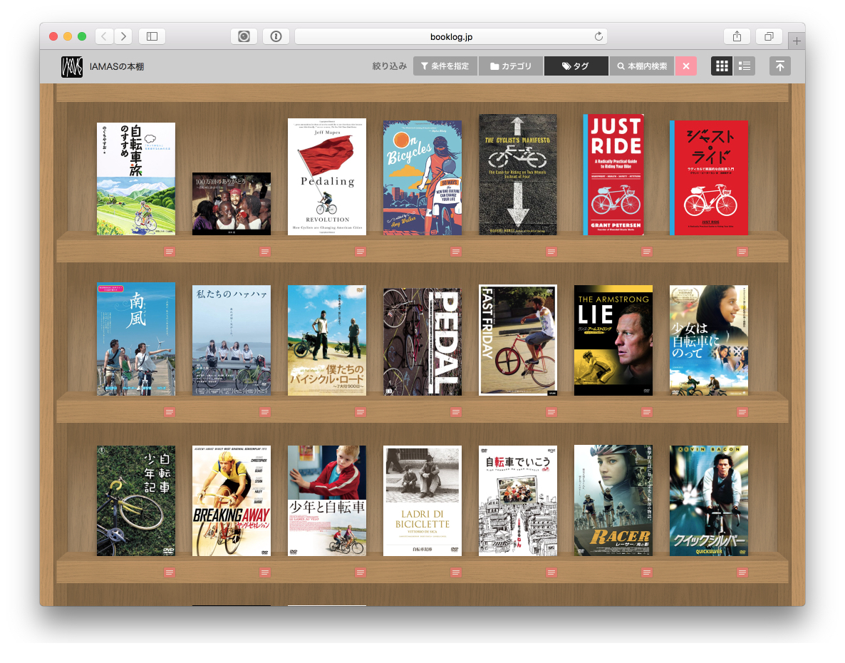 そこで、対処策のひとつとして、 ブクログの「IAMASの本棚」で、クリティカル・サイクリングのタグ付けを行った。自転車タグではないのは「チャーチル・ファクター」のような書籍を拾えないからだ。つまり、自転車の本ではなく、クリティカル・サイクリングが選んだ本というタグになる。仮想本棚に並んだ書籍やDVDは眺めるだけでも楽しい。本を並び替えて整理できれば、さらに有益だろう。
