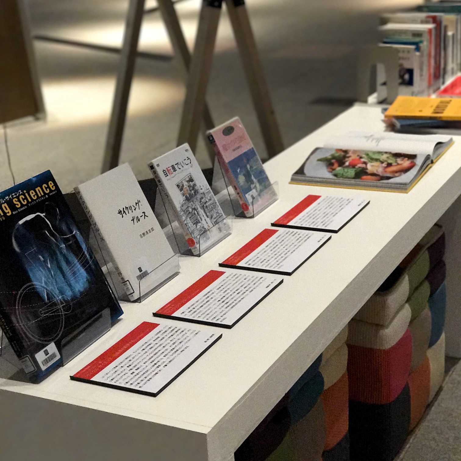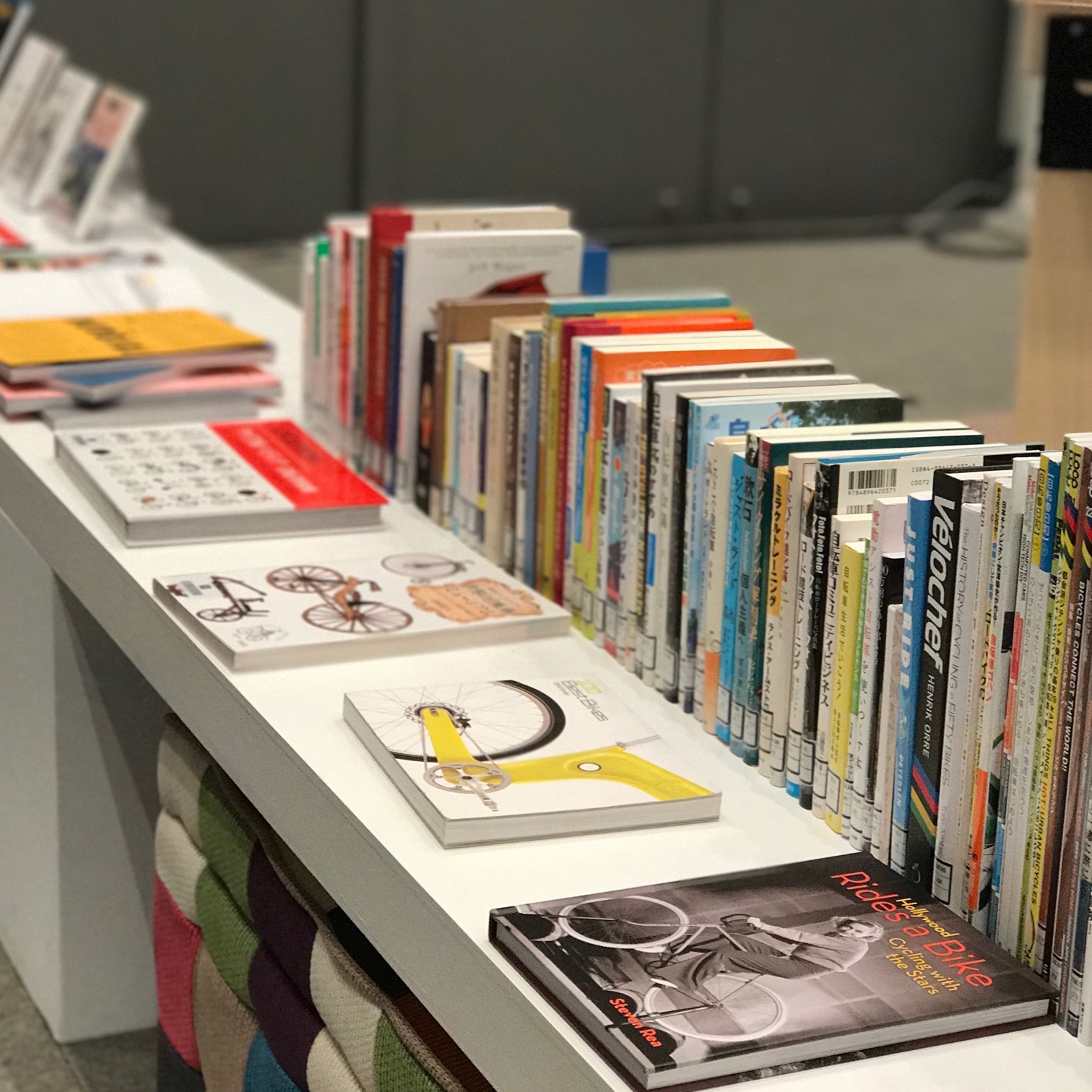 これらの資料はIAMAS(情報科学芸術大学大学院)付属図書館に依頼して、蔵書として購入し、管理していただいている。また、メンバーの個人所蔵としても資料が集まりつつある。これらを一堂に会して展示したのが、Critical Cycling展の資料コーナーだ。2016年夏には多くを机に平置きできたが、2017年冬には長い棚に背差し陳列しなければならないほど充実しつつある。