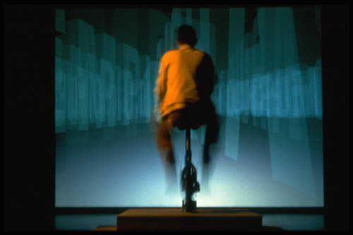 ところで、この作品はVR(バーチャル・リアリティ、仮想現実)技術によるメディア・アートの初期傑作「The Legible City」(1989)へのオマージュでもある。面白いことに、そのプロトタイプではジョイスティック操作だったのが、最終的には自転車が採用されている。また、CG(コンピュータ・グラフィックス)で巨大なアルファベットの塊を並べた街路を前面スクリーンに投影している。