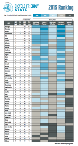 これは「2015 BICYCLE FRIENDLY STATE℠ RANKING」で、アメリカ50州の各交通局に対して行った調査の結果だ。これによれば、ナンバー・ワンはワシントン州で、次いで2位ミネソタ州、3位デラウェア州、4位マサチューセッツ州、5位ユタ州と続く。そして、その次の6位がオレゴン州だ。この結果に知人も衝撃を受けていた。故郷は最高の自転車の聖地だと思っていたのだから。