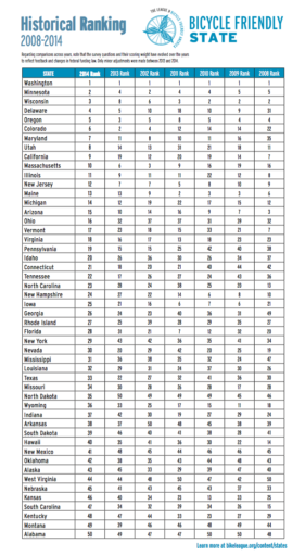 同じランキングの2008年から2014年までの推移を見れば、ワシントン州は不動の1位であり、評価ポイントも他を引き離している。よほどの筋金入りの自転車フレンドリー地域なのだろう。これは現地調査に行きたくなる。上位の顔ぶれは大きく変動しないものの、デラウェア州が31位から3位へと躍進しているのが目につく。オレゴン州は3〜8位で、ナンバー・ワンは幻想だったようだ。