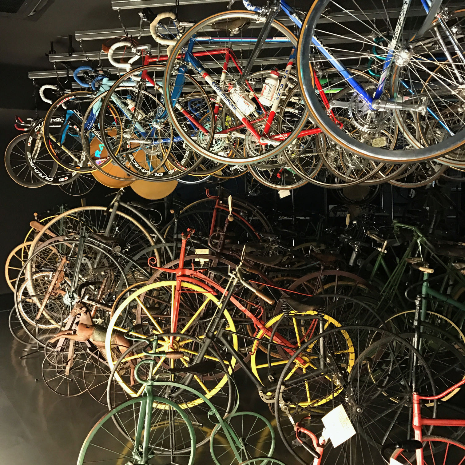 階下の1階に移って「見える収蔵庫」では、約250台もの自転車がぎっしりと詰められている。展示しきれない自転車を保管しながら、その全体像を見せるアイディアが秀逸。個々の自転車には簡単なラベルしか付いていないものの、歴史的な自転車や特殊な自転車、そしてオリンピックで活躍した自転車などもある。この圧巻の物量によって、普段は意識しない自転車の膨大な営みが胸に迫ってくる。