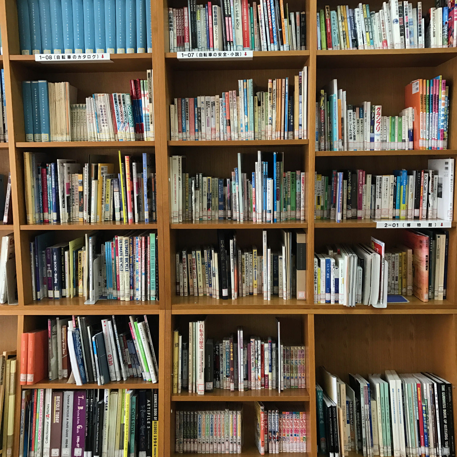 1階には図書館もある。それほど広い部屋ではないが、それでも壁一面、天井まで届く書架に自転車関連の書籍が並べられている。50年以上に渡って刊行された「ニュー・サイクリング」などの雑誌や、冒頭の自転車通学シーンが有名な「はいからさんが通る」といった漫画を含めて幅広く所蔵されている。ただ、映像や音楽などの資料はなく、蔵書リストが公開されていないのが残念。