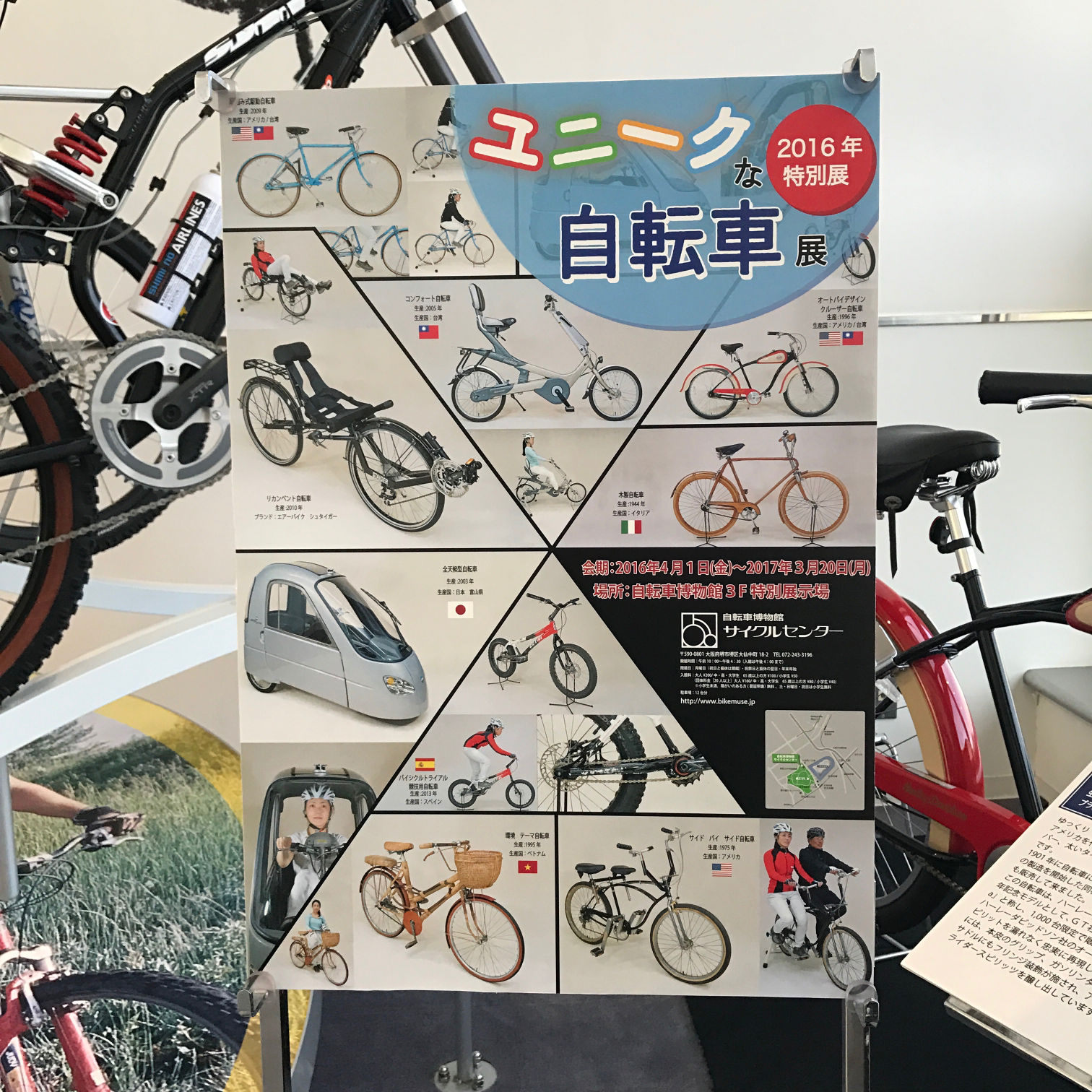 3階には2016年度の企画展として「ユニークな自転車」が10台ほど展示されてる。セミリカンベントのRevive、ソラーパネル付き全天候型電動アシスト・トライクのAWTT、2人が並んで漕ぐサイド・バイ・サイド自転車などが楽しい。また、常設展示では、今日の代表的な自転車の紹介や、世界一周旅行に使われた自転車も置かれている。ブレーキやギアの仕組みを学ぶ科学館的設備もある。