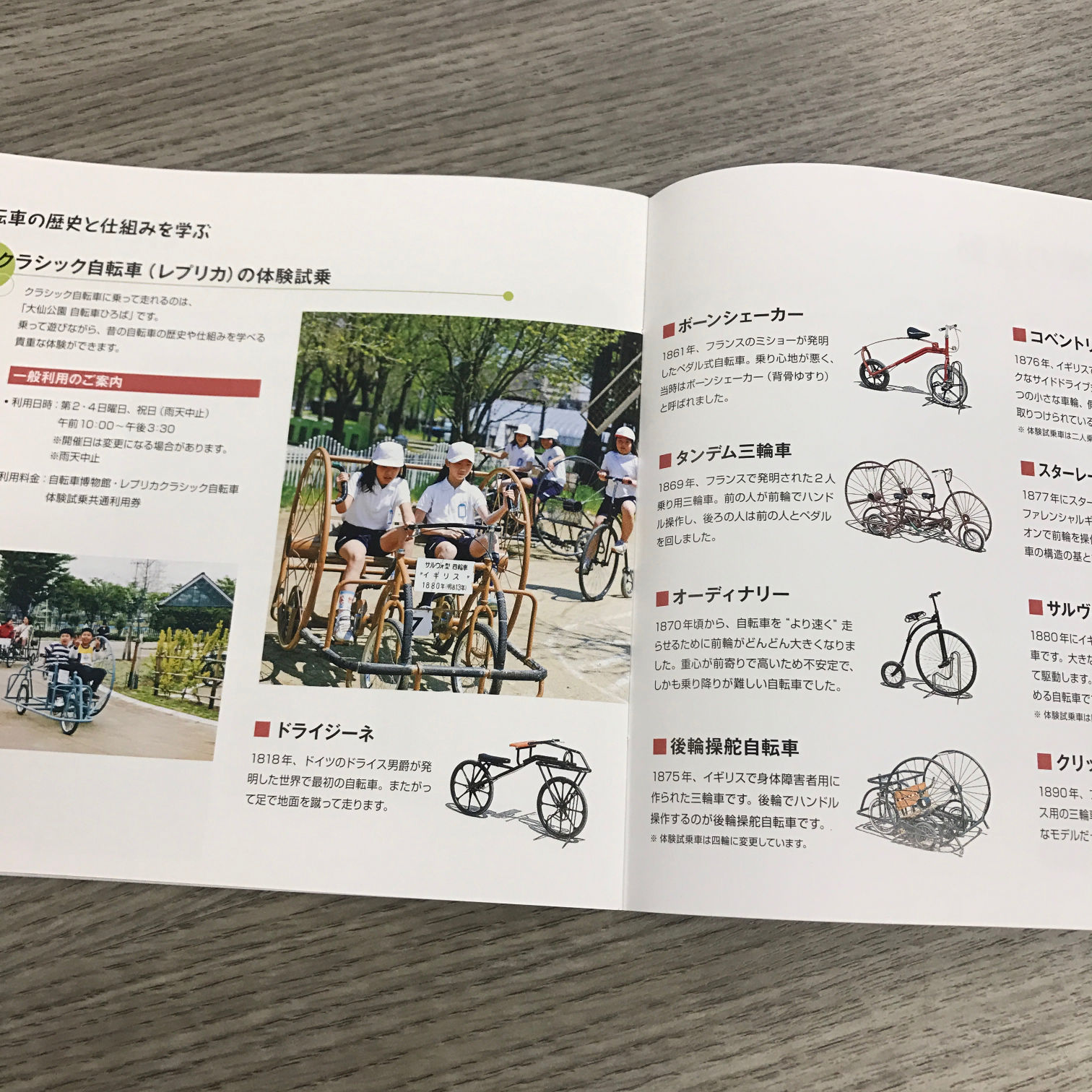 さらに、一般の博物館でも常に感じることだが、静態展示やビデオ紹介では体感できないことにフラストレーションを覚える。乗ってナンボの自転車なら尚更だ。そこで、近くの「自転車ひろば」では、歴史的な自転車のレプリカに試乗できる。ドライジーネやオーディナリーに実際に乗れるのだから、これはまたとない体験になるはず。今回の訪問は開催日ではなかったので、再訪の大きな理由になった。