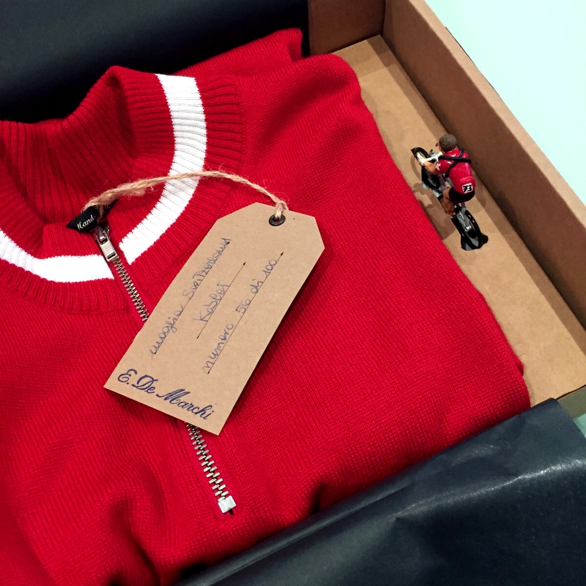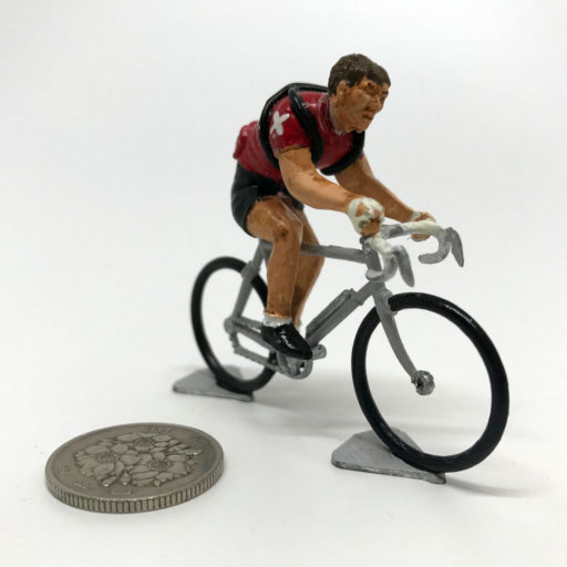 最初に手にした自転車のミニチュアは、De Marchiのジャージのオマケだった。真っ赤な生地に白いラインが鮮烈で、肩にも大きな白十字が織り込まれている。これはスイスのユーゴ・コブレ(Hugo Koblet)が1954年に着用していたジャージのレプリカ、今日では珍しいウール地で、シリアル番号(56/100)入り。いかにも高級品っぽいが、同じジャージを着て疾走するミニチュアは微笑ましい。