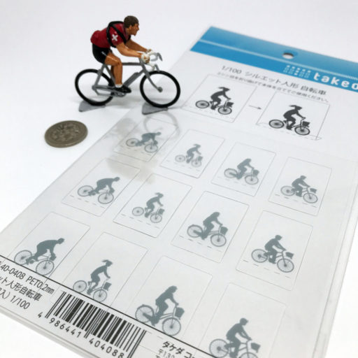 同じく平面模型には、タケダのシルエット人形の自転車がある。こちらは立体感はなく、塩化ビニールにシルエットが印刷されたシンプルなもの。ただ、印刷だけにスポークやチェーンも描かれている。シートの下部を折り曲げて、シルエットを立てて使うことが想定されているが、両面テープで貼り付けてシール化するのも良さそう。1/50、1/100、1/200と3サイズ揃っている。