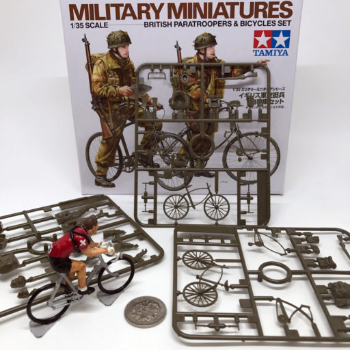 タミヤのプラモデル、1/35 ミリタリー・ミニチュア・シリーズにも自転車があり、イギリス軍空挺兵自転車セットとドイツ歩兵自転車行軍セットだ。これは戦争と自転車の関係を調べた時に気がついた。De Marchiミニチュアより小型にもかかわらず、スポークもあり、各部が精緻に再現されている。空挺兵の自転車は折り畳めるが、正確にはフレームを切断するので元には戻らない。