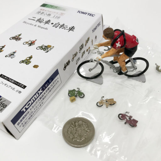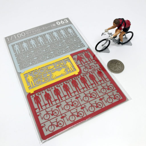 そのスジでは有名なテラダモケイの1/100建築模型用添景セットにも自転車がある。これは紙の模型ながら、雰囲気たっぷり。No.063のサイクルロードレース編は、その名の通り、ロード・バイクとレーサーが勢揃い。しかも、サポート用のオートバイや沿道で応援する悪魔など芸が細かい。自転車ショップとメディアが協力・監修した本格派。他には、アムステルダム編や屋台編などにも自転車が登場する。
