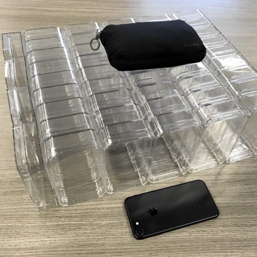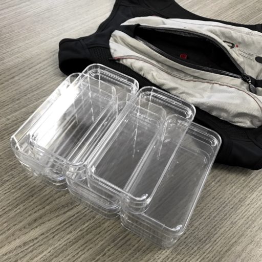 それでは容量はどうか? これは、同じ形のものを荷室に詰めて比較できる。ピンポン球などが良いが、ここではiPod touchのケースで試してみた。これはiPhone 7を4台重ねた大きさ。まず、スパイダー・バッグにもボディ・バッグにもケースが8個入った。いずれも伸縮性があるので、無理なく収められる程度での収納とした。それぞれiPhone 7を32台を背負えることになる。