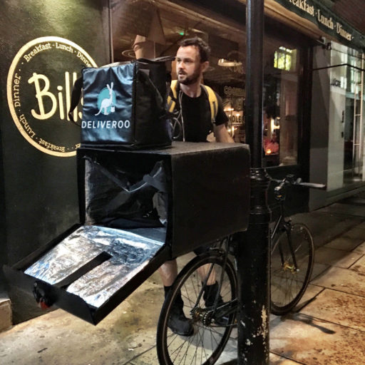 箱のロゴから分かるように、彼が携わっているのはDeliveroo。ロンドン初のフード・デリバリー専門の、急成長を続ける注目スタートアップ。出前と言っても、伝統的なそれではなく、モバイル・テクノロジーを最大限に活用したサービスを展開中。つまり、Deliverooはレストランと利用者と配達人を結びつけ、その流動を最適化する情報サービスだ。新しい酒を古い革袋に入れる意欲作と言える。
