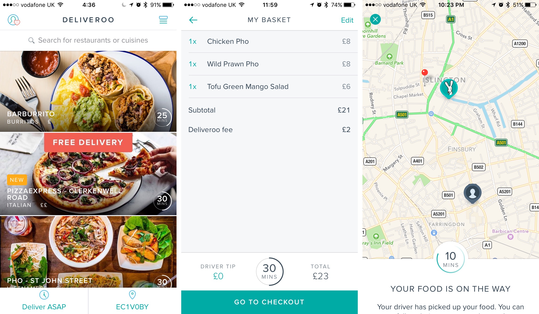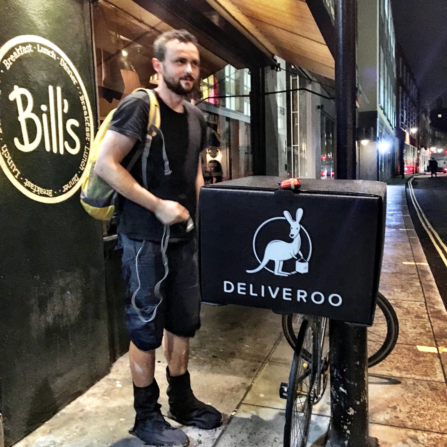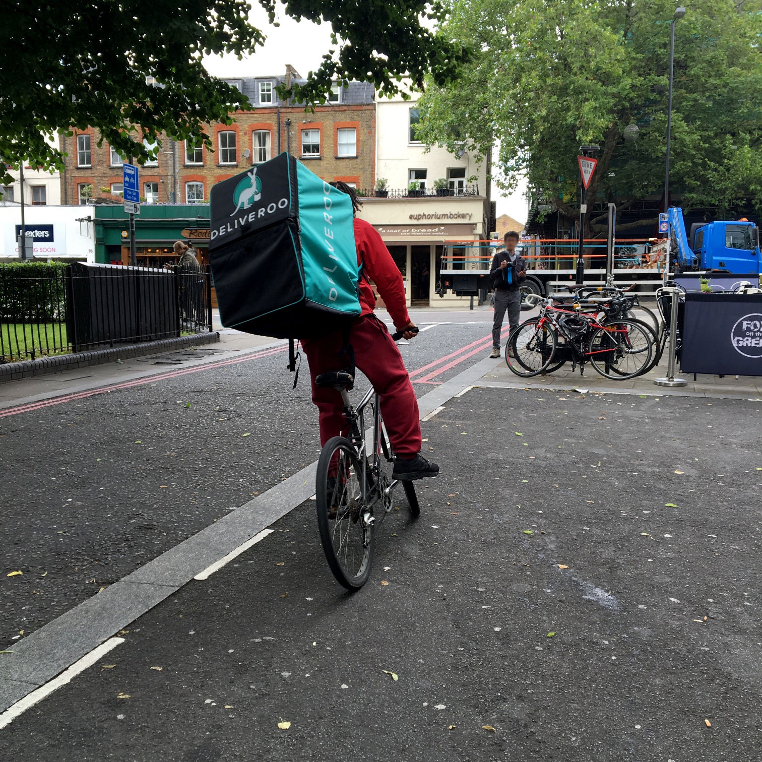 箱のロゴから分かるように、彼が携わっているのはDeliveroo。ロンドン初のフード・デリバリー専門の、急成長を続ける注目スタートアップ。出前と言っても、伝統的なそれではなく、モバイル・テクノロジーを最大限に活用したサービスを展開中。つまり、Deliverooはレストランと利用者と配達人を結びつけ、その流動を最適化する情報サービスだ。新しい酒を古い革袋に入れる意欲作と言える。