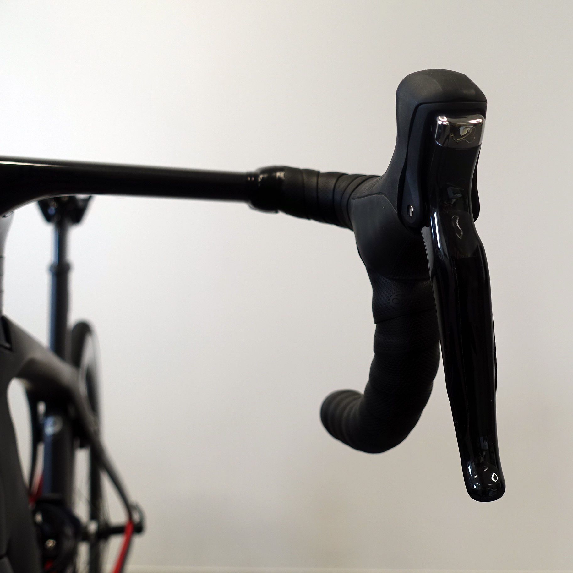 これが新機能のシンクロシフトで、右手操作だけで済むのは快適。すぐに慣れる。前後ギアの組み合わせを考えるのではなく、軽くする、重くする、と単純に感覚的に操作すれば良いからだ。電動式が楽なのは、機械式のレバーを押し込む力が不要であるだけでなく、精神的負担が少ないからだ。シンクロシフトは、これを一歩先進める。機械操作に思い煩わされず、道を駆けることに集中する快感。