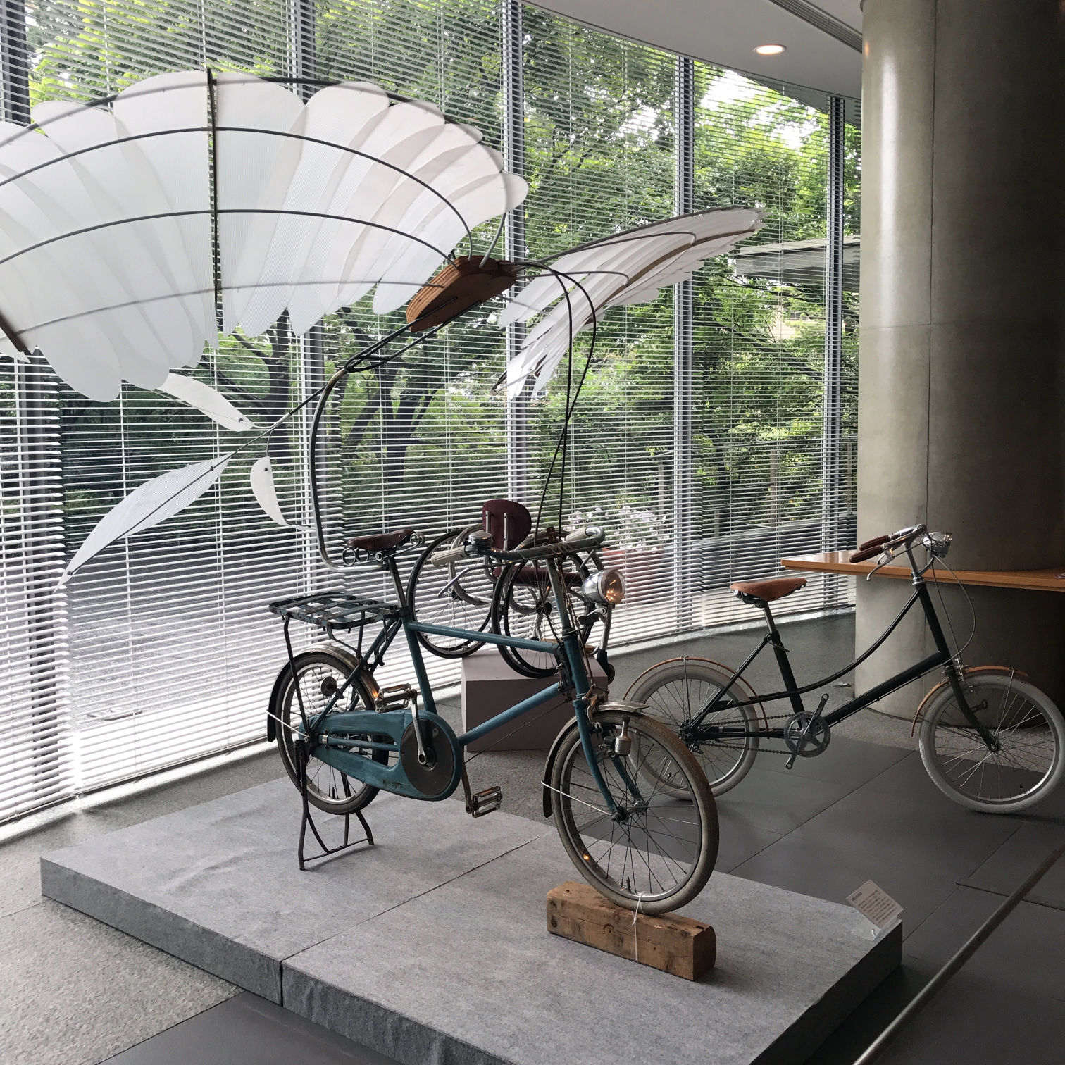 美術館のエントランスでは、茅ヶ崎在住のサイクル・アーティスト谷信雪氏の手になるオリジナル自転車が迎えてくれる。特に、羽根付き自転車は本展のための新作だそうで、優美な白い翼と経年劣化した車体の対比が印象的。実用性は無いだろうが、一方で障害者のための車椅子や、災害時利用も想定した貨物自転車が傍らに置かれており、単なる美術品に留まらない作家の志向が現れている。