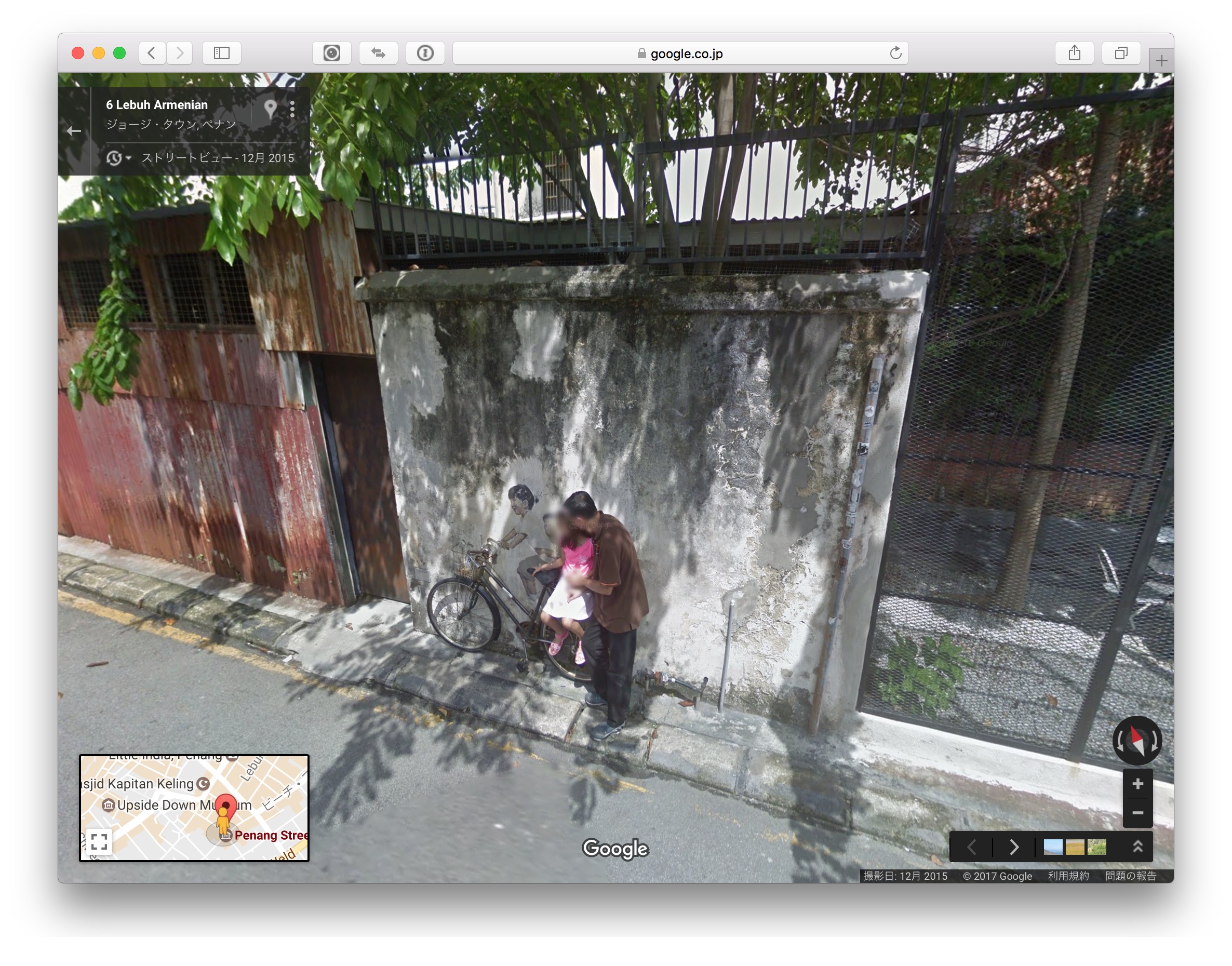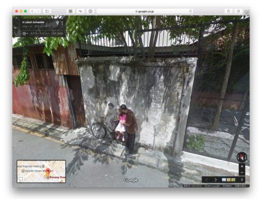 さらに調べると、ジョージタウンのストリート・アートを訪ね歩くサイトがあった。設置位置とお薦め経路が記載されたマップも見つかった。これで作品に辿り着ける。だが、今も現存していているのだろうか。そこで、ストリート・ビューを開いてみる。驚いたことに、作品が残っているだけではなかった。そこには自転車の荷台に腰掛ける娘と父親、そしてカメラを向ける母親がいた。