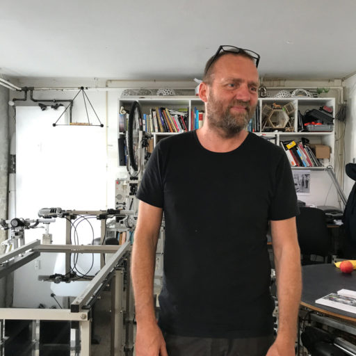 工房の前室はショールームを兼ねていて、これまでに制作した自転車が所狭しと置かれている。いくつかは垂直に自立しており、箱型のフレームを持つXYZ Cargoの特徴をうまく活かしている。人工芝を敷き詰めた広い平面を持ち、連結してモバイル公園として活用する自転車や、攻殻機動隊のタチコマを連想させる電動モーターを備えた多脚テーブルまである。すべて「移動する何か」であるようだ。