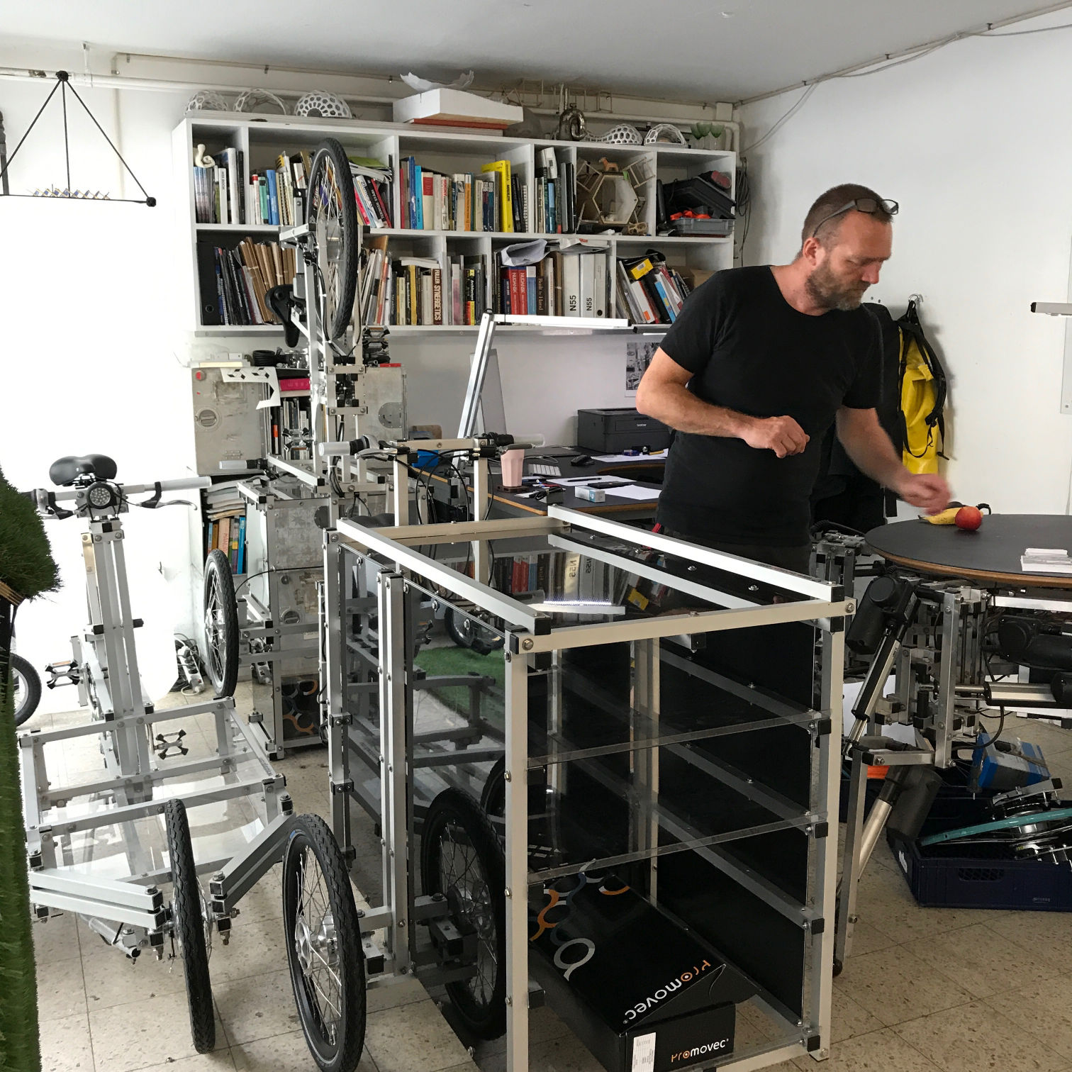 工房の前室はショールームを兼ねていて、これまでに制作した自転車が所狭しと置かれている。いくつかは垂直に自立しており、箱型のフレームを持つXYZ Cargoの特徴をうまく活かしている。人工芝を敷き詰めた広い平面を持ち、連結してモバイル公園として活用する自転車や、攻殻機動隊のタチコマを連想させる電動モーターを備えた多脚テーブルまである。すべて「移動する何か」であるようだ。
