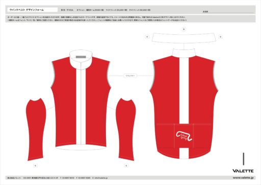 このようにしてオーダーしたのは、赤、および黒のウィンド・ベスト(ジレ)。そして赤の長袖ジャージ。いずれも、期待していた通りのシンプルさと鮮明さで、発注した誰もが気に入ったようだ。少し残念であったのは、素材と色のサンプルは小さな布切れなので、実際の仕上がりが想像しにくいことだろうか。実物大は難しいとしても、より大きなサンプルであれば雰囲気がつかみ易いと思われる。