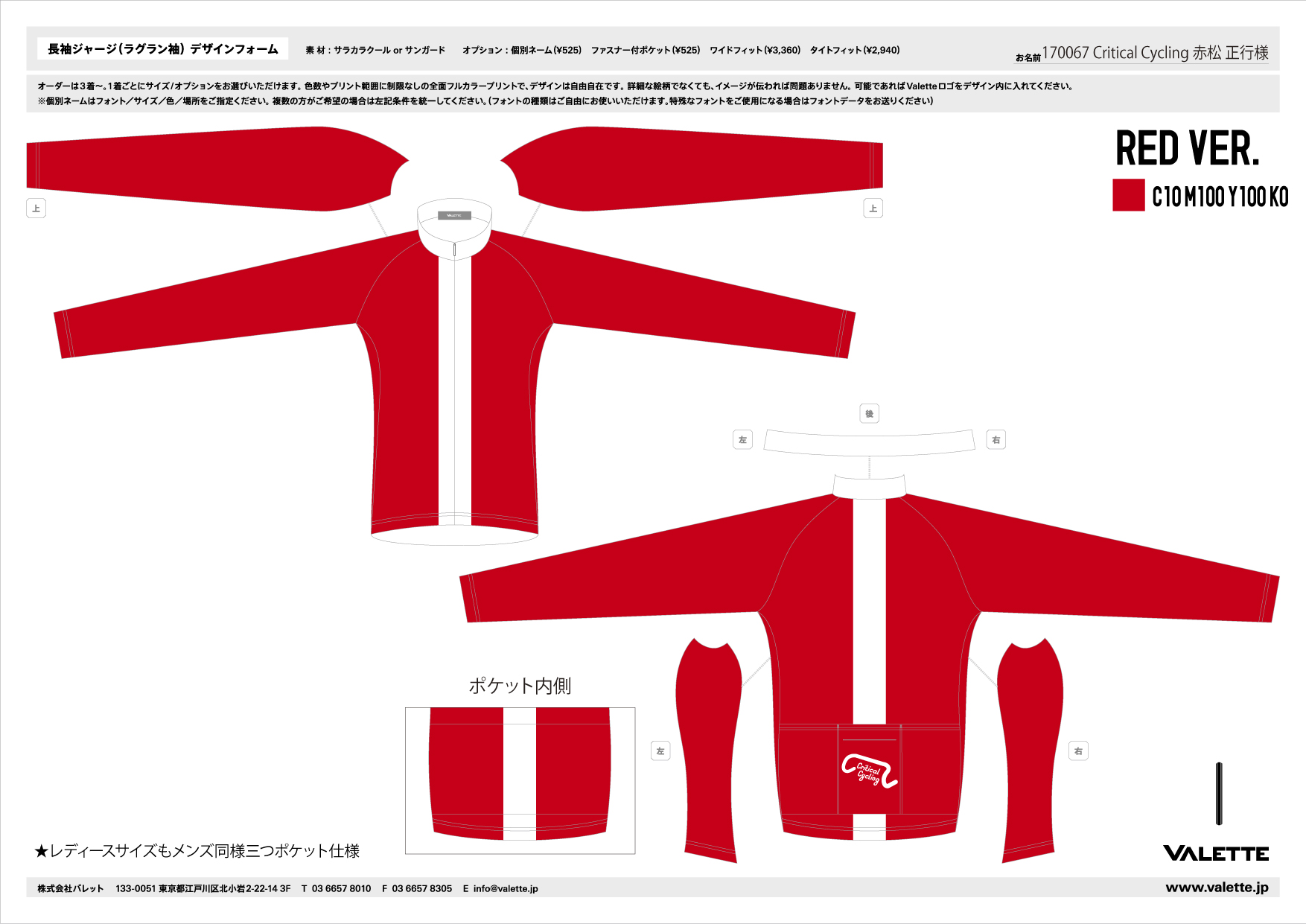ウェアのデザインとしては何案かあったが、最終的に採用したのは、全体をシンボル・カラーの赤で染め上げ、前後の中央に垂直に太い白ラインを入れ、背中の3つポケットの中央にシンボル・マークを入れるもの。シンボル・マーク自体は控えめながら、シンボル・マークを連想させる白ラインが鮮烈な印象を与えることを狙った。全体としてはシンプルなので、ウェアの種類やカラー変更に対応できるはず。
