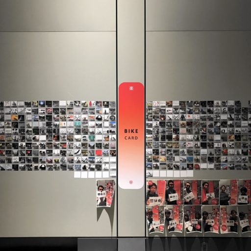 磁性があるBike Cardを金属板に置けば、剥がすことも移動することも簡単。クリティカル・サイクリング展ではホワイトボードに並べたり、会場の金属壁に貼り付けたりした。磁性とは関係ないが、広いテーブルに展開したこともある。今年度はIAMAS学内の一角に常設展示となり、いつでも全カードを眺められる豪華絢爛状態。これはガラス壁にカードと同じ幅の金属でストライプを作っている。