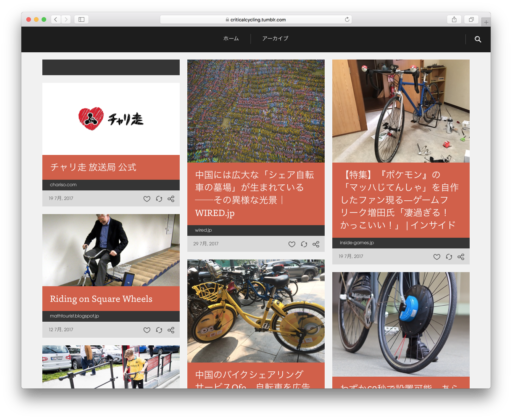 クリティカル・サイクリングではWEBサービスのTumblrを利用して、自転車関連の情報の収集を行っている。その名も criticalcycling.tumblr.com で、最初の登録が2016年3月、現在の登録数は447。メンバーの趣味趣向に従って、その時折々のニュースやトピックを登録している。思いつくまま記事をスクラップしていて、内容は偏向気味ではあるが、気軽にフォローしていただければ幸いだ。