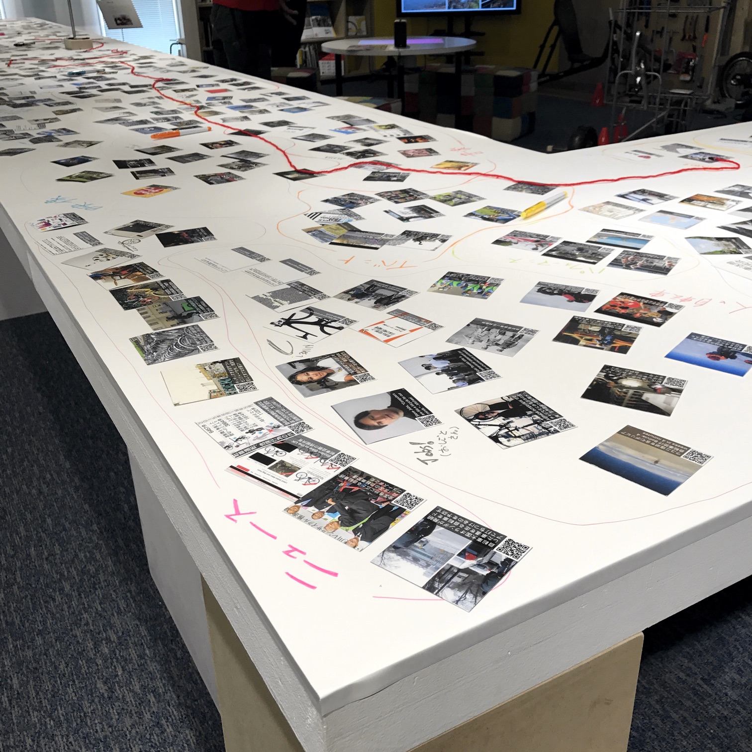 さらに、Critical Cycling+移動体芸術展 2017 Summerでは、幅数メートルの長大なテーブルにカードを置けるようにした。テーブルの天板は白板のように文字や図を描き込める。このようにして、来場者がカードを並び替えたり、グルーピングしたり、コメントを書き込んだりすることを促した。自然発生的に何百枚ものカードが評価され、組織化される様子は興味深いものであった。