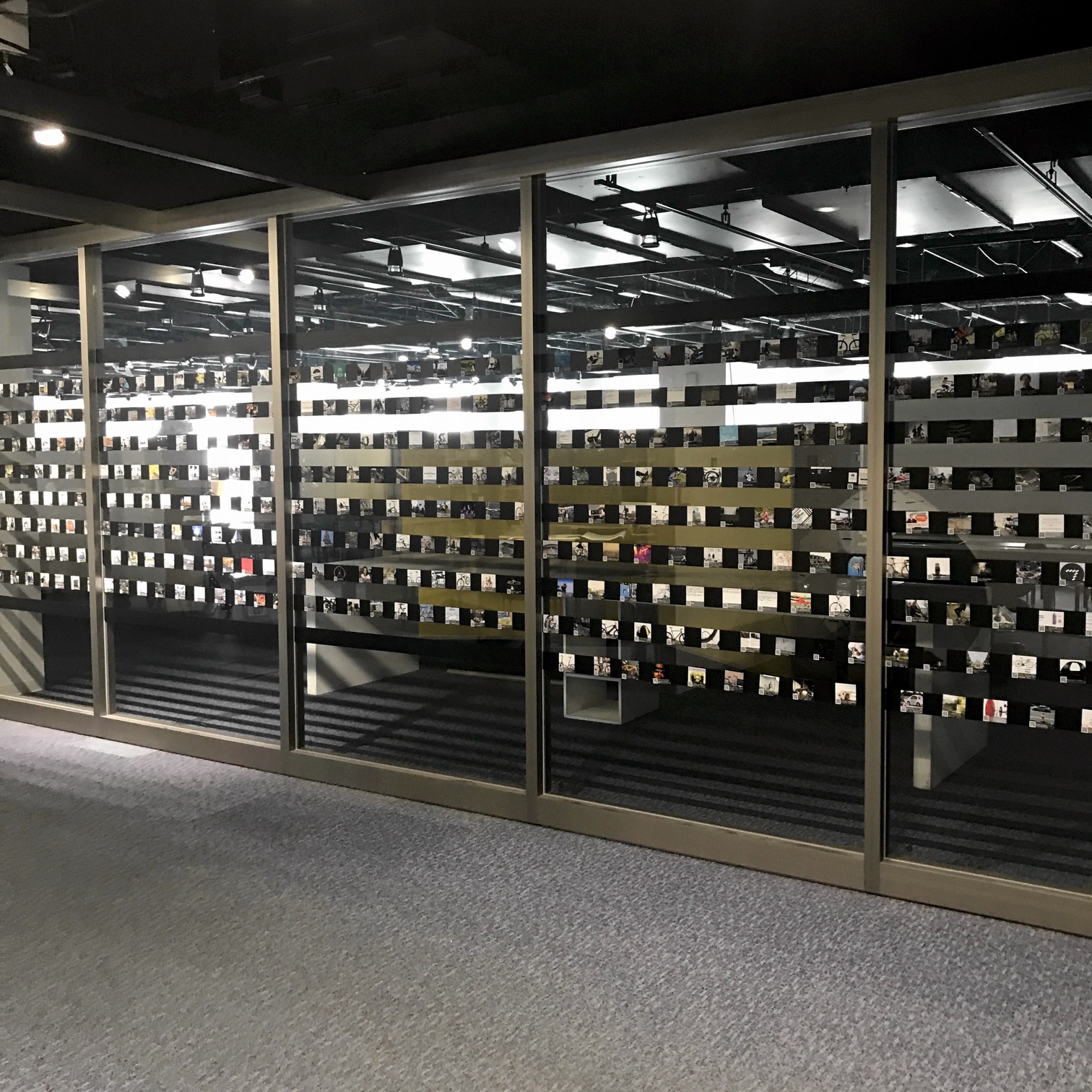 磁性があるBike Cardを金属板に置けば、剥がすことも移動することも簡単。クリティカル・サイクリング展ではホワイトボードに並べたり、会場の金属壁に貼り付けたりした。磁性とは関係ないが、広いテーブルに展開したこともある。今年度はIAMAS学内の一角に常設展示となり、いつでも全カードを眺められる豪華絢爛状態。これはガラス壁にカードと同じ幅の金属でストライプを作っている。