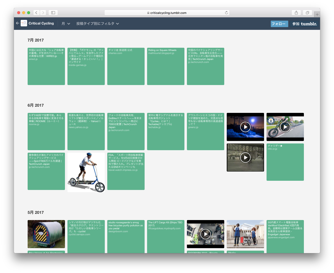 クリティカル・サイクリングではWEBサービスのTumblrを利用して、自転車関連の情報の収集を行っている。その名も criticalcycling.tumblr.com で、最初の登録が2016年3月、現在の登録数は447。メンバーの趣味趣向に従って、その時折々のニュースやトピックを登録している。思いつくまま記事をスクラップしていて、内容は偏向気味ではあるが、気軽にフォローしていただければ幸いだ。
