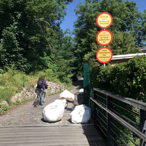 その特徴的な独自ルールのひとつは、自動車の禁止だ。実際にもクリスチャニア内では自動車が走っていないだけでなく、クリスチャニアに入る道には大きな石がいくつも置かれ、進入を拒否している。武器や暴力と同じく、自動車はあってはならないわけだ。一種のユートピア思想かもしれないが、排気ガスによる環境破壊や、交通事故による人々の死傷を考えれば、あながち否定できない。