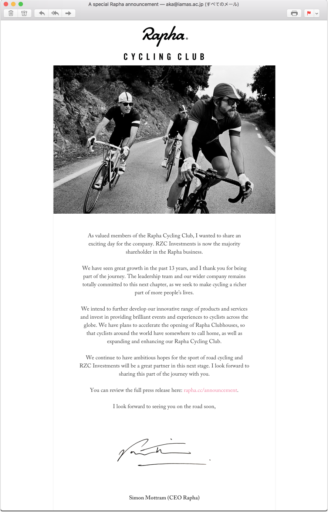 8月8日の未明、ふと目が覚めてチェックすると、サイモン・モットラム(Simon Mottram)氏からの「A special Rapha announcement」なるメールが届いていた。同氏はサイクリングに特化したアパレル・ブランドRaphaの創立者であり、CEO(最高経営責任者)。何度か会ったことはあるが、直接メールをもらうほどの仲ではない。何事かと思いながら、メールを開いてみた。